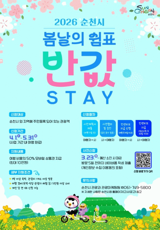 시 관계자는 “이번 ‘반값 STAY’는 여행객들이 비용 부담 없이 순천의 아름다운 봄을 만끽하고, 지친 몸과 마음을 치유할 수 있는 ‘쉼표’ 같은 기회가 될 것”이라며, “단순히 지나가는 관광에서 벗어나 깊이 있게 머물며 회복하는 ‘웰니스 치유 도시’ 순천의 매력을 알리는 데 최선을 다하겠다”고 밝혔다.