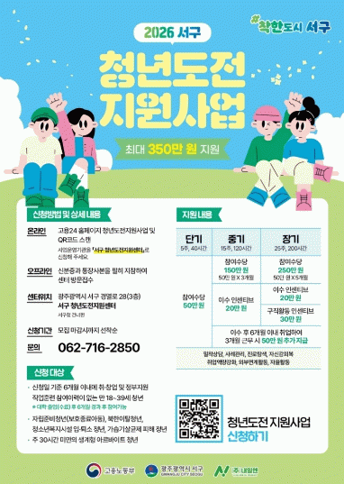 참여 신청은 ‘고용24’ 또는 서구 청년도전지원센터에서 가능하며 자세한 사항은 서구 청년도전지원센터로 문의하면 된다.