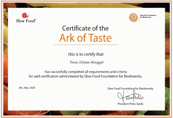 시 관계자는 “여수의 특산물이 세계적 가치를 인정받은 뜻깊은 성과”라며 “앞으로도 지역 고유의 맛과 이야기를 지속적으로 발굴·보존해 나가겠다”고 밝혔다.