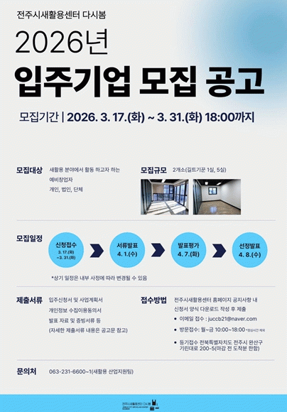 신청은 전자우편 또는 우편·방문 접수로 가능하며, 입주기업 모집과 관련한 자세한 사항은 전주시새활용센터 다시봄 누리집에서 확인하거나 전화로 문의하면 된다.