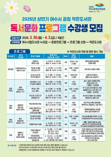 참여를 희망하는 시민은 여수시립도서관 누리집을 통해 온라인으로 신청하거나 해당 도서관에 전화 또는 방문 접수할 수 있다.