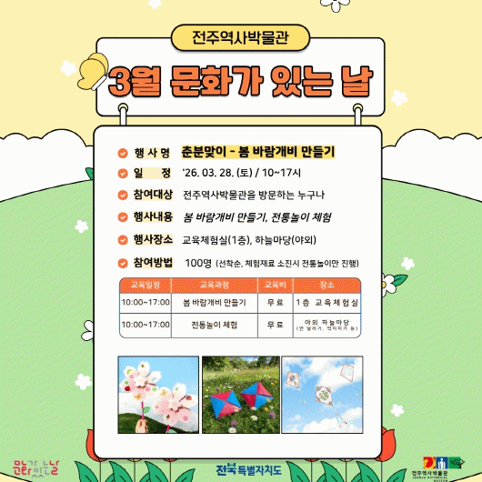 전주역사박물관 관계자는 “이번 춘분맞이 행사가 봄의 따뜻한 기운 속에서 온 가족이 함께 즐기는 소중한 시간이 되길 바란다”면서 “앞으로도 매달 다양한 문화 체험의 기회를 드릴 수 있도록 알찬 프로그램을 준비하겠다”고 말했다.