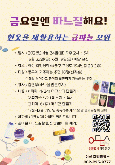 모집 대상은 동구에 주소를 둔 주민 10명(선착순)이며, 세 차례 모두 참여하고 이후 동아리 활동까지 가능한 주민을 우대한다. 참가비는 1인당 1만 원으로, 프로그램 종료 후 전액 환급된다. 준비물은 바느질에 사용할 헌옷 3벌(니트류 제외)이다.