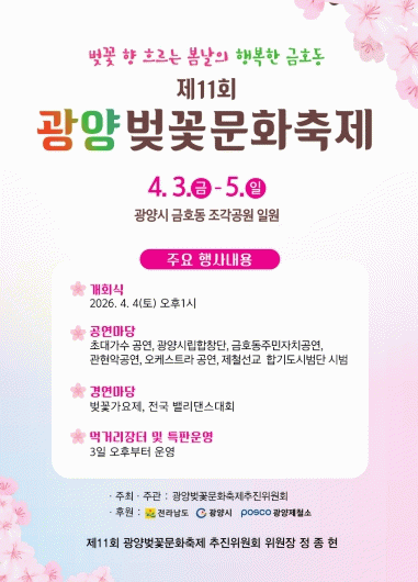 정종현 광양벚꽃문화축제추진위원장은 “제11회 광양벚꽃문화축제가 지역주민은 물론 전국에서 찾아오는 관광객들에게 봄날의 행복한 기억으로 남길 바란다”며 “안전하고 쾌적한 축제 운영을 위해 준비에 최선을 다하겠다”고 밝혔다.