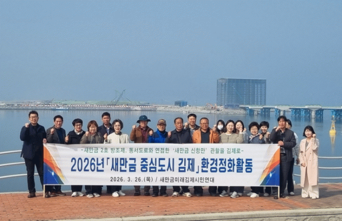 지난 26일 시민연대 위원들과 시 새만금경제국 직원 60여 명은 새만금 2호 방조제에 있는 바람쉼터 일원에 모여‘2026년도 제1회 김제 새만금 환경 정화 활동’을 실시했다.