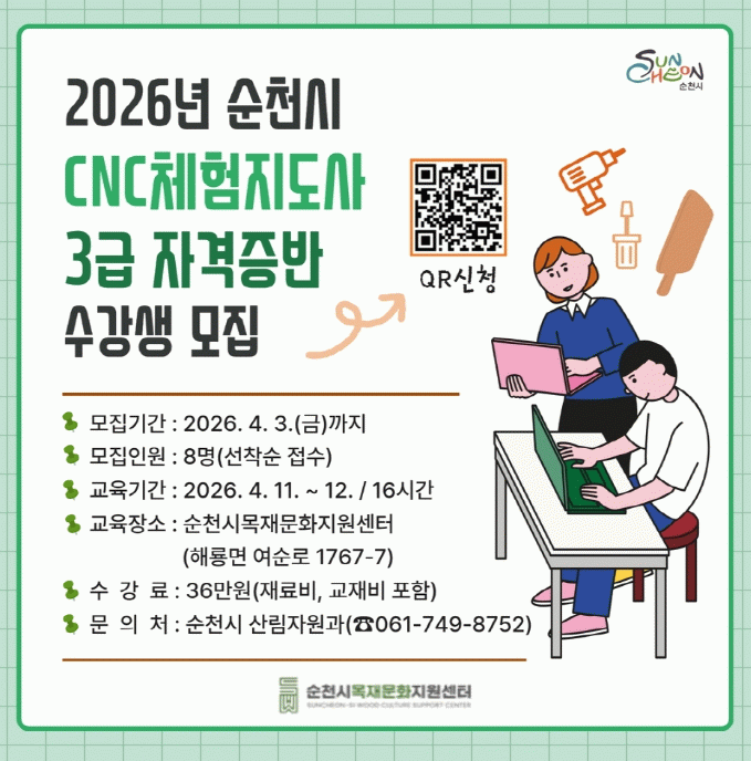 시 관계자는 “이번 교육을 통해 수강생들이 목공 전문 기계에 대한 이론과 실습을 함께 익히고 자격증 취득까지 이어지길 기대한다”며 “목공 분야 취업을 준비하는 시민들에게 실질적인 도움이 되기를 바란다”고 말했다.