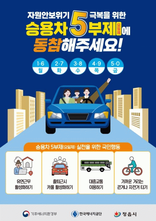 시는 청사 주차장 및 진입로에서 차량 5부제 준수 여부를 지속해서 점검하고, 직원들의 대중교통 이용과 카풀을 적극적으로 권장할 방침이다.