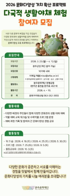 완주문화재단 관계자는“다국적 생활야채 체험은 서로 다른 문화적 배경을 가진 주민들이 함께 참여하는 과정에서 문화다양성을 이해하고 확장해가는 프로젝트”라며 “군민들이 서로의 다름을 존중하고 공존하는 경험으로 이어지길 기대한다”고 전했다.