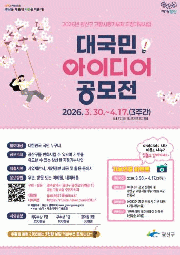 또한 공모 신청자 중 광산구에 10만 원 이상 고향사랑기부한 선착순 40명에게 1만 원 상당의 상품권을 지급하는 기부인증 행사도 진행한다.