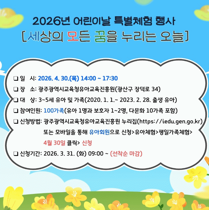 김경애 광주유아교육진흥원장은 “어린이날을 맞아 유아들이 마음껏 뛰어놀며 가족과 소통할 수 있는 다채로운 체험 프로그램을 준비했다”며 “온 가족이 참여할 수 있는 이번 행사에 많은 관심과 참여를 바란다”고 말했다.