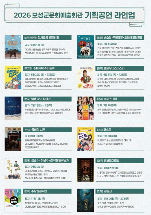 공연별 티켓 예매 일정과 세부 프로그램은 추후 ‘보성군문화예술회관 누리집을 통해 안내된다.