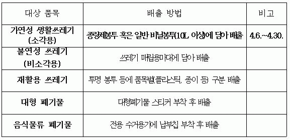 다만, 불연성(비소각용) 쓰레기, 음식물류 폐기물 등을 혼합 배출하는 경우에는 수거 대상에서 제외되며, 불법쓰레기 무단투기로 간주되어 과태료가 부과될 수 있으므로 주의할 것을 당부했다.