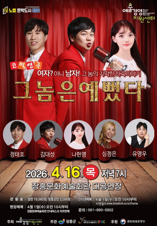 티켓 예매는 4월 1일 오전 10시부터 티켓링크와 장흥문화예술회관 현장 예매를 통해 할 수 있다. 관람료는 전석 1만 원이며 장흥군민은 70% 할인된 3천 원에 구매할 수 있다.
