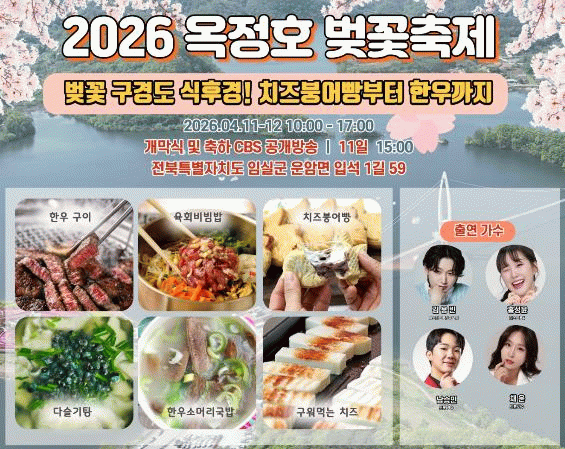 군은 벚꽃이 만개하는 아름다운 4월, 임실군의 봄을 대표하는 ‘2026 임실 옥정호 벚꽃축제’를 오는 4월 11일부터 12일까지 이틀간 옥정호 출렁다리와 붕어섬 생태공원 일원에서 개최하는 가운데 임실에서만 맛볼 수 있는 특별한 먹거리를 선사한다.