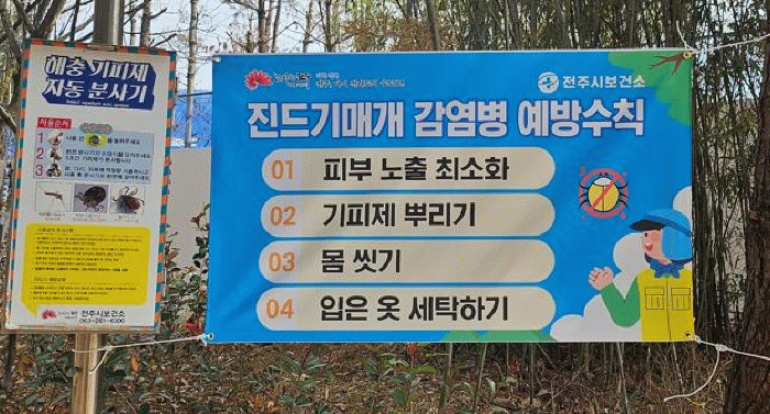 이에 보건소는 진드기매개감염병 예방을 위해 주요 등산로와 산책로, 야호 아이숲 등 총 38개소에 해충기피제 자동분사기를 설치·운영하고 있다.