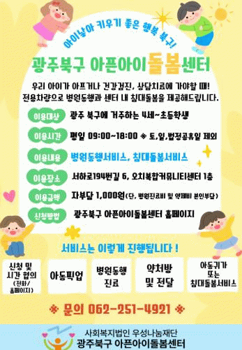 사업 대상은 북구 거주 만 4세~12세 아동이며 아픈아이 돌봄센터 누리집 또는 유선을 통해 신청할 수 있다.