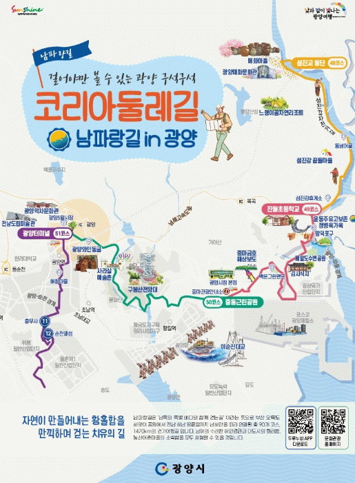 남파랑길 광양 구간은 48코스부터 51코스까지 총 60.9km로, 섬진강과 광양만, 도심과 산, 역사와 산업, 문화예술이 어우러진 복합형 걷기 코스다.