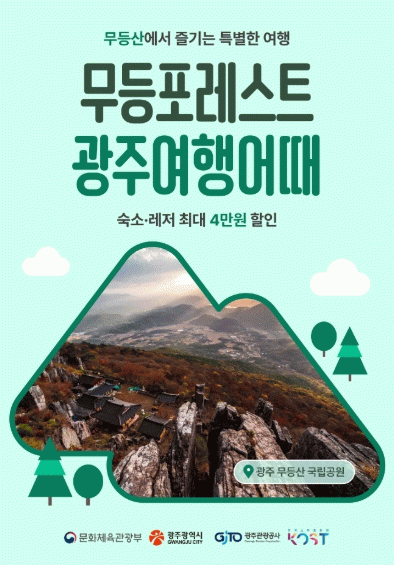 온라인 여행 플랫폼 ‘여기어때’에서 숙박 최대 3만원, 레저 이용권 최대 1만원 등 1인당 최대 4만원까지 추가 할인을 받을 수 있다. ‘무등포레스트’는 문체부와 광주시가 함께 자연과 도심을 함께 즐길 수 있는 광주지역 관광자원을 활용해 방문객 체류 시간을 늘리기 위해 추진하고 있다.