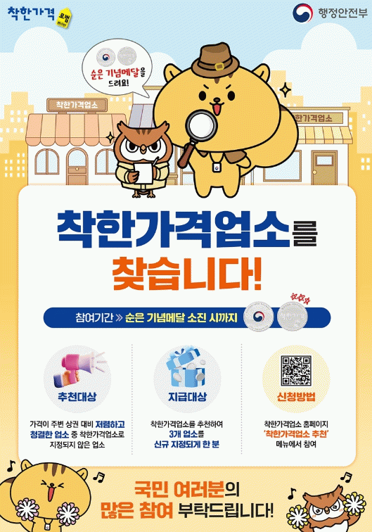 시 관계자는 “고물가 상황 속에서도 착한가격업소가 지역 경제의 든든한 버팀목 역할을 하고 있다”며, “앞으로도 지속적인 발굴과 지원을 통해 시민과 소상공인이 함께 상생할 수 있는 환경을 만들어가겠다”고 말했다.