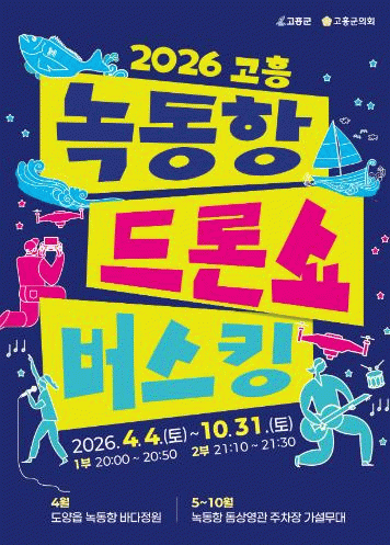한편, ‘2026 녹동 클린(CLEAN) 국가어항 조성 공사’가 5월부터 12월까지 녹동항 바다정원에서 진행됨에 따라, 5월 9일부터는 버스킹 공연 장소를 돔 상영관 부근 주차장으로 옮겨 운영할 예정이다.