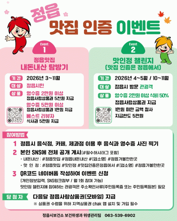 해당 이벤트 안내·QR코드는 정읍시청 누리집, 공식 SNS 채널, 또는 각 업소에 비치된 안내 게시물에서 확인할 수 있다.