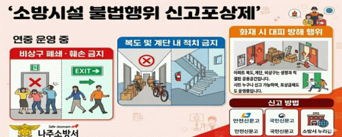 나주소방서 관계자는 “신고포상제를 통해 비상구 폐쇄·소방시설 차단 행위를 근절하고 가족, 이웃의 소중한 생명을 지킬 수 있도록 적극 동참해 주길 바란다”고 말했다.