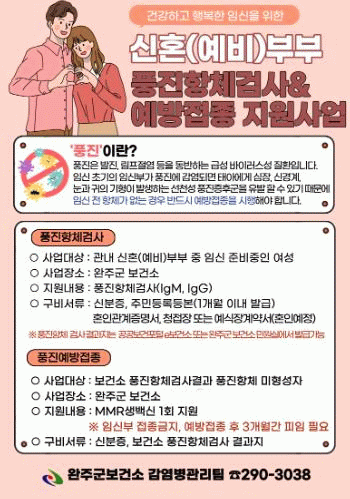 풍진 예방접종지원 사업은 관내 임신을 준비 중인 신혼(예비)부부 여성을 대상으로 진행되며, 보건소에서 풍진 항체검사(IgM, IgG)를 무료로 받을 수 있고, 검사 결과 항체가 없는 경우에는 홍역·볼거리·풍진(MMR) 예방접종을 1회 지원한다.
