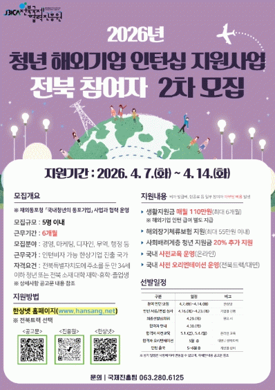 지원 대상은 만 34세 이하 전북 청년으로, 전북 거주자 또는 도내 대학 재·휴학생 및 졸업생 등 일정 요건을 충족해야 한다. 해외 근무가 가능한 경우 누구나 지원할 수 있으며, 참여를 희망하는 청년은 4월 7일부터 14일 18시까지 한상넷 홈페이지를 통해 온라인으로 신청하면 된다. 이후 기업별 서류 및 면접 심사를 거쳐 최종 선발될 예정이다.
