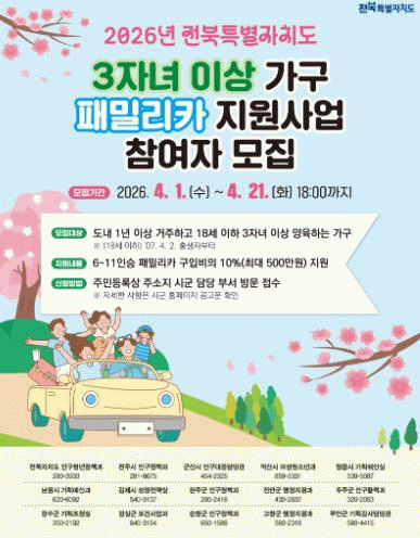 임실군 관계자는“이번 사업을 통해 다자녀 가구의 이동 편의 증진과 양육 부담 완화에 실질적인 도움이 되기를 기대한다”며 부모들이 체감할수 있는 출산 친화적 환경을 조성하기 위해 최선을 다하겠다“고 말했다.
