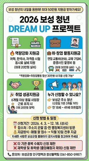지원 대상은 보성군에 주민등록을 두고 3개월 이상 계속 거주 중인 18세부터 49세까지의 청년이며, 역량 강화부터 취업 정착까지 이어지는 단계별 맞춤형 지원체계로 운영된다.