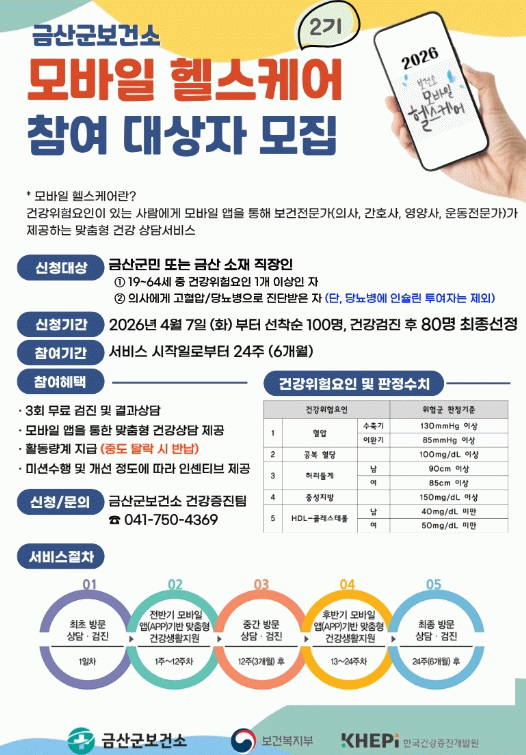 참여 신청 및 문의는 금산군보건소 건강증진팀에 하면 된다.