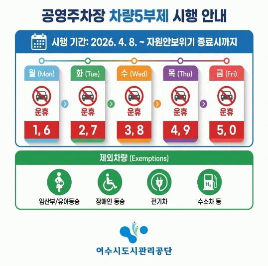 다만, 전통시장 및 관광지 인근 등 주차난이 발생할 우려가 있는 지역을 제외한 5개 주요 주차장에 입차 제한이 적용되며, 대상 주차장은 ▲박람회장 ▲용기공원 ▲소호요트마리나 ▲웅천해변공원2 ▲화장동 공영주차장이다. 그 외 30개 공영주차장도 차량 5부제 적용 대상이나, 입차 제한 없이 시민들의 자율 참여를 유도할 계획이다.