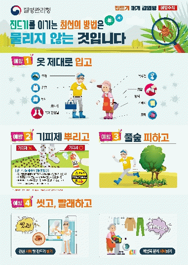 구체적인 예방법은 ▲ 진드기 노출을 최소화할 수 있는 복장 갖춰 입기(밝은 색 긴옷, 모자, 손수건, 목이 긴 양말, 장갑 등) ▲ 진드기 기피제와 돗자리 사용하기 ▲풀 위에 옷 벗어놓거나 풀밭에서 용변보지 않기 ▲ 귀가 시 전신 샤워 및 작업복 분리 세탁하기 등이다.