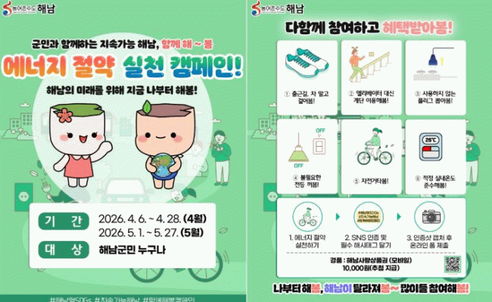 참여를 원하는 군민은 일상 속 실천 장면을 본인 SNS에 필수 해시태그(#해남형SDGs #지속가능해남 #함께해봄캠페인)와 함께 게시한 뒤, 캡처 화면을 전용 온라인 폼으로 제출하면 된다.