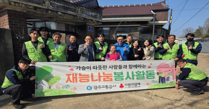 공사는 이에 앞서 지난 25일 광산구 진곡동에서 주거 취약 가구를 위한 재능나눔 봉사활동도 실시했다. 이날 차량운영처 직원 10여 명은 청각장애가 있는 독거노인 세대를 찾아 노후된 등기구와 콘센트 등 전기시설을 교체하고, 도배 및 장판을 교체해 안전하고 쾌적한 주거환경을 조성했다.