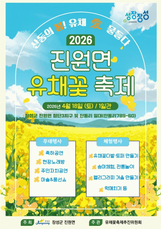 진원면이 주최하고 유채꽃축제추진위원회가 주관하는 이번 축제는 진원면의 관문인 산동리 일대 약 1.2㎞ 구간에 가득 피어난 유채꽃밭에서 펼쳐진다.