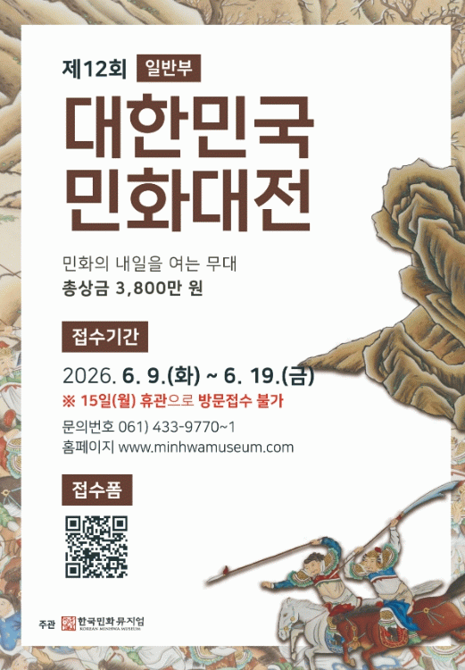 ‘제12회 대한민국민화대전’에 관한 자세한 공모 요강은 한국민화뮤지엄 홈페이지공지사항에서 확인할 수 있으며, 세부 사항은 유선을 통해 안내받을 수 있다.