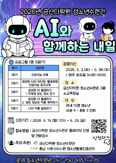금산군청소년수련관 관계자는 “인공지능(AI) 기술이 일상화되는 시대에 청소년들이 올바른 이해와 활용 능력을 갖추는 것이 중요하다”며 “이번 프로그램을 통해 창의적 사고와 디지털 역량을 함께 키우는 기회가 되길 바란다”고 전했다.
