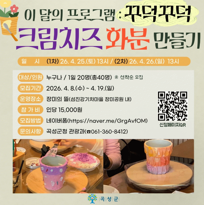 군 관계자는 “이번 프로그램은 화분 만들기와 장미 식재 체험을 통해 장미를 보는 데서 그치지 않고 직접 가꾸는 즐거움까지 느낄 수 있도록 기획했다”라며, “장미의 뜰에서 다마스크 장미를 함께 관람하며 곡성의 봄과 장미의 매력을 오롯이 느껴보는 시간이 되길 바란다”라고 전했다.