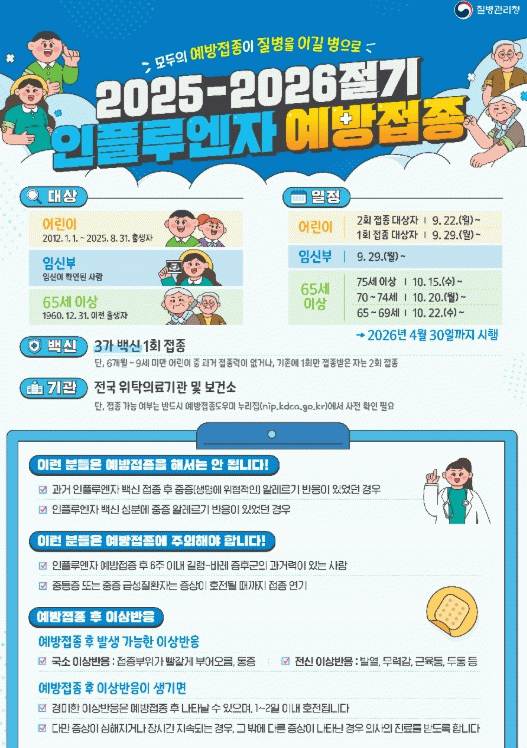국가 예방접종 지원 대상은 ▲생후 6개월부터 13세까지의 어린이 ▲임신부 ▲65세 이상 어르신이며, 위탁의료기관 47개소에서 무료로 접종을 받을 수 있다.