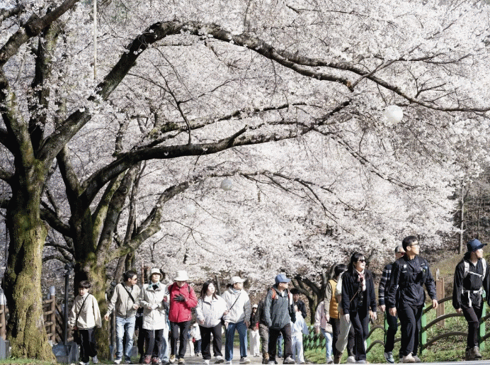 진안군은 평균 해발고도가 약 350m인 고지대로 인해 늦은 벚꽃으로 마지막까지 봄을 담고 싶어 하는 관광객들로 붐빈다.