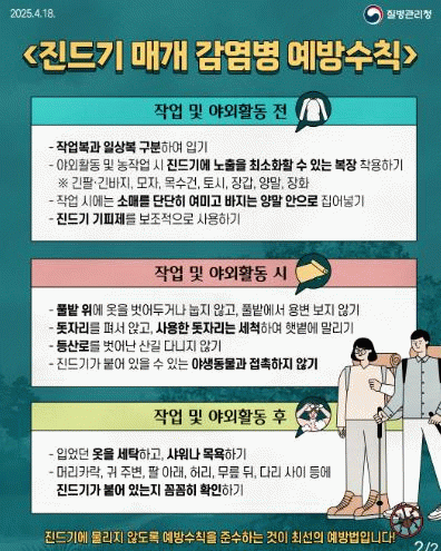진드기 매개 감염병의 주요 예방수칙은 ▲농작업 시 긴 옷 착용하여 피부 노출하지 않기 ▲기피제 사용하기 ▲풀밭 위에 옷 벗어두거나 눕지 않기 ▲외출 후 샤워하기 ▲입었던 옷 세탁하기 ▲몸에 진드기 붙어 있는지 꼼꼼히 확인하기 등이 있다.