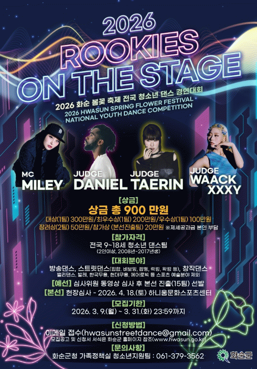 이번 대회는 전국 각지에서 모인 청소년들이 화순의 아름다운 봄꽃을 배경으로 끼와 열정을 펼치는 무대로, 축제의 분위기를 한층 끌어올릴 것으로 기대된다.