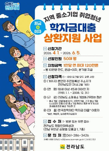 강석운 전남도 희망인재육성과장은 “이번 사업을 통해 지역 중소기업에 근무하는 청년의 학자금 상환 부담을 실질적으로 줄이고 지역 인재의 이탈 방지와 정착을 유도하는 환경을 조성하겠다”고 말했다.