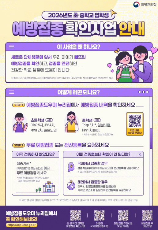 초·중학교 입학은 단체생활이 시작되는 시기로, 예방접종 완료 여부 확인은 감염병 확산을 예방하는 가장 기본적인 조치다. 이에 시는 입학생을 대상으로 필수 예방접종 여부를 사전에 점검하고, 미접종자에 대한 접종을 적극 안내하고 있다.