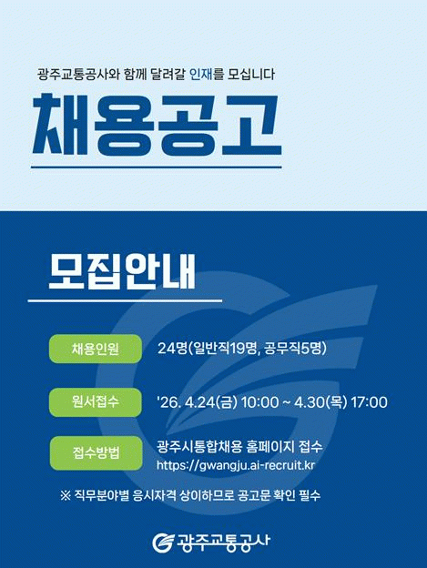 자세한 내용은 광주교통공사 홈페이지 ‘채용공고’에서 확인하거나 총무팀으로 문의하면 된다.