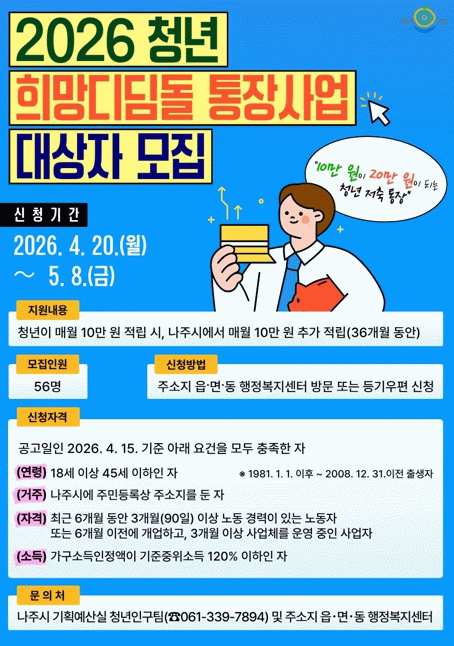나주시는 2026년 청년 희망디딤돌 통장사업 신규 참여자 56명을 오는 5월 8일까지 모집한다고 17일 밝혔다.
