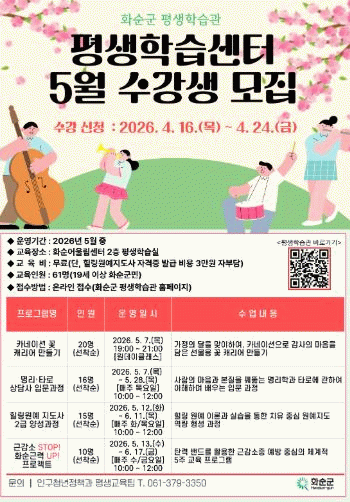 수강 신청은 4월 16일부터 4월 24일까지 화순군 평생학습관 누리집을 통해 온라인으로 접수하면 된다.