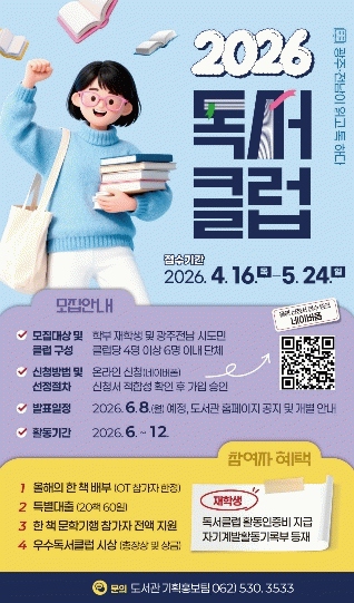 한편, 전남대학교는 매년 ‘올해의 한 책’을 선정해 작가 초청 한 책 톡 콘서트, 도서교환전, 테마도서 전시회, 한 책 문학기행, 독서후기 공모전 등 다양한 프로그램을 운영하고 있으며, 2026년 ‘올해의 한 책’은 한 책 선정위원회의 심사를 거쳐 6월 중 열릴 ‘한 책 선포식’에서 공개되어 본격적인 사업의 시작을 알릴 예정이다.