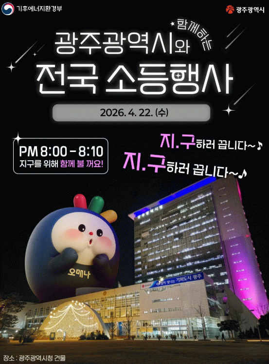 특히 광주시는 ‘지구를 위해 함께 불 꺼요! 지.구하러(지구 구하러) 끕니다’ 메시지를 전달하며, 공공기관뿐만 아니라 일반가정, 아파트, 상가 등에서도 자발적으로 참여할 수 있도록 에너지 절약 실천 분위기를 조성할 계획이다.